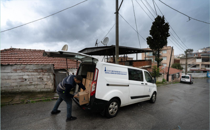 İzmir Büyükşehir Belediyesi’nin hanelere teslim ettiği paket içinde mercimek, pirinç, kuru fasulye, nohut, makarna, bulgur, salça, un, sıvı yağ, tuz, çay ve şeker yer aldı.