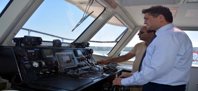Protokolü taşıyan bot Avcı Ramadan Çocuk Oyun ve Rekreasyon Alanı’na doğru dönüşe geçtiğinde Aliağa Belediye Başkanı Serkan Acar, dümene geçerek seyir yaptı. Başkan Serkan Acar, bot ile kısa bir gösteri de yaptıktan sonra botu iskeleye yanaştırarak aborda etti.
