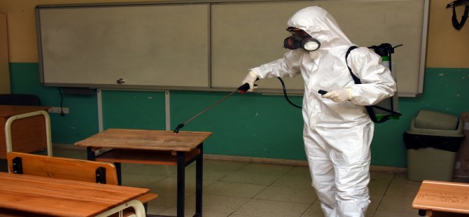 Kentin çeşitli noktalarında dezenfekte çalışmalarını sürdüren Aliağa Belediyesi, çalışmalarını kentte faaliyet gösteren okullarda sürdürüyor. Ekipler, okulları bahçe ve girişten başlayarak, sınıfları, koridorları, kapıları, merdivenleri, sıraları ve tuvaletleri özel solüsyonla dezenfekte ediyor. Dezenfekte işleminin ardından öğretmen ve öğrencilerin elle temas edebilecekleri bölgeler silinerek özenle hijyenik hale getirildi.